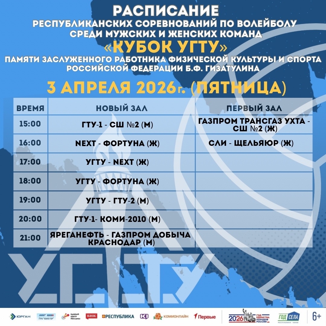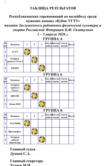 Представляем вашему вниманию расписание игр Республиканских соревнований по волейболу среди мужских и женских команд «Кубок УГТУ» памяти Заслуженного работника физической культуры и спорта Российской Федерации Бориса Гизатулина.