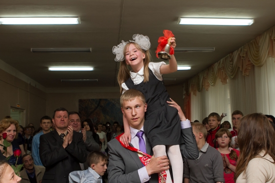 Праздничный концерт закончился нестареющим вальсом и вручением цветов учителям и сотрудникам интерната. Первоклассница Роза Бажукова, восседая на плече Александра Шишелова, проплыла по залу, звеня колокольчиком. Сверху ей лучше всех были видны и нескрываемая радость, и непрошеные слезы — неразлучные спутники последнего школьного звонка.