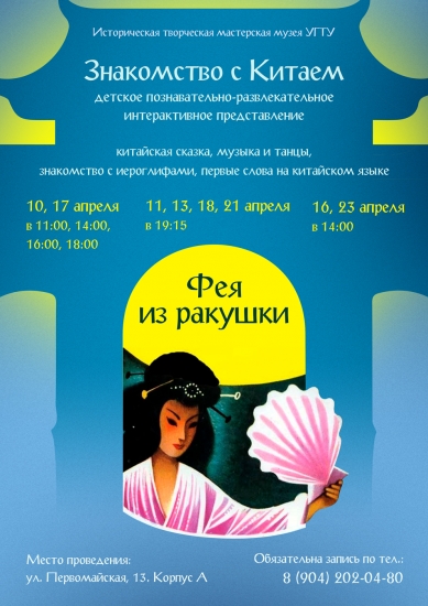 Историческая творческая мастерская музея УГТУ приглашает детей на познавательно-развлекательное интерактивное представление «Фея из ракушки». Идея мероприятия – знакомство с Китаем!