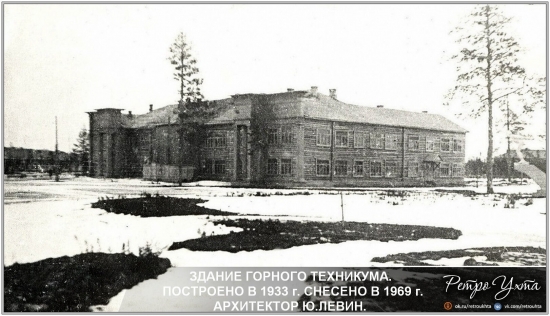 Продолжаем цикл материалов "История УГНК", посвященных 90-летнему юбилею Ухтинского горно-нефтяного колледжа (Горно-нефтяного техникума). Здание построено в 1933 году по проекту московского архитектора Ю. В. Левина как Горный техникум. С 1947 г. здесь располагалось Управление Ухтижемлага. С 1953 года - Проектно-изыскательская контора, в 1962 году преобразованная в Ухтинский филиал Института Печорпроект.