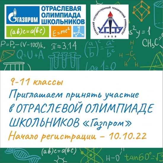 ПАО «Газпром» приглашает учащихся 9 – 11 классов принять участие в Отраслевой олимпиаде школьников «Газпром» (далее – Олимпиада). Олимпиада проводится по шести предметам: математика, физика, химия, информационные и коммуникационные технологии (предмет «информатика»), экономика, инженерное дело.