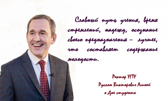 Дорогие студенты и выпускники УГТУ, я от всей души желаю вам, чтобы все ваши надежды непременно сбылись! Мы любим вас, мы гордимся вашими успехами в профессии, науке, учебе, спорте и общественной работе. И мы точно знаем: это только начало, закладка профессиональных и личностных основ будущей полноценной и интересной жизни. И пусть этот замечательный праздник придаст импульс радости и мотивации каждому вашему замыслу и делу! Будьте здоровы и счастливы
