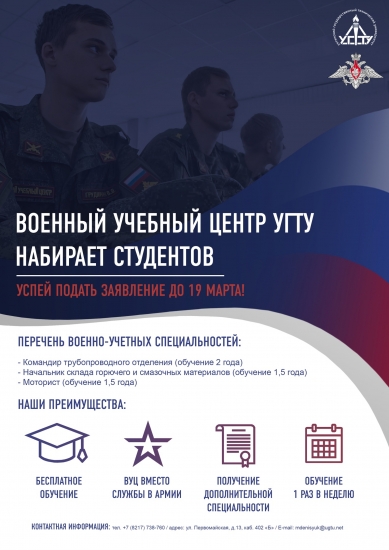 До 19 марта идет прием заявлений кандидатов на поступление в Военный учебный центр при Ухтинском государственном техническом университете.