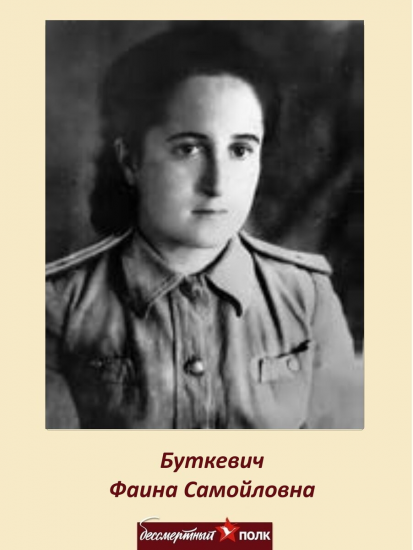 Фаина Самойловна Буткевич родилась 20 февраля 1915 г. в Звенигородке Черкасской области. Среднюю школу окончила в 1929 г. с 1929 по 1931 годы училась в ФЗУ в г. Днепропетровске, по окончании его работала на мебельной фабрике.