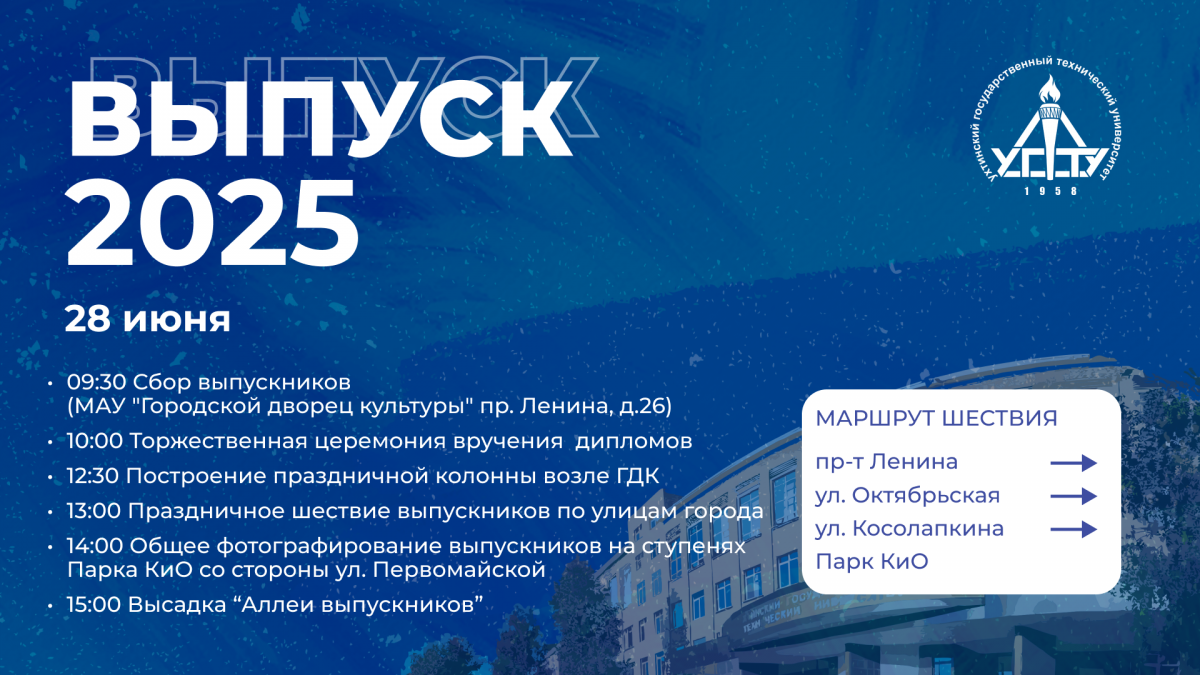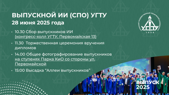 28 июня 2025 года состоится торжественное вручение дипломов выпускникам УГТУ. В программе дня праздничные мероприятия, шествие по улицам города, общее фотографирование и высадка саженцев на Аллее выпускников.