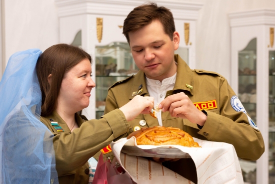 Вчерашний день начался с весёлых испытаний на крыльце альма матер, где жениху предстояло доказать свою эрудицию, отвечая на непростые вопросы. Затем последовал шуточный «выкуп» с импровизированными зачётами в деканате и забавными заданиями для молодожёнов. Кульминацией стала торжественная церемония в зале геологического музея университета. Среди минералов и окаменелостей — символами прочности их чувств — ректор произнёс тёплую напутственную речь и вручил паре традиционный каравай.