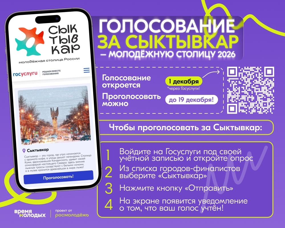 Вы знаете, что сейчас проходит важное голосование за выбор Молодежной столицы России на 2026 год? Наша столица - город Сыктывкар тоже принимает участие в конкурсе.