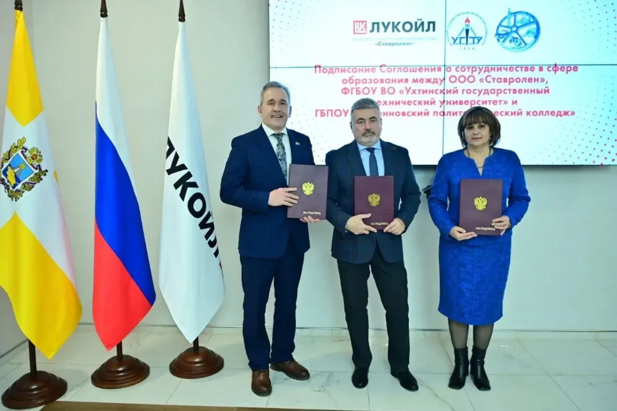 На площадке ООО «Ставролен», входящего в группу ПАО «Лукойл», состоялось подписание трехстороннего соглашения о сотрудничестве в сфере образования между Ухтинским государственным техническим университетом, Государственным бюджетным профессиональным образовательным учреждением «Буденновский политехнический колледж» и самим предприятием.