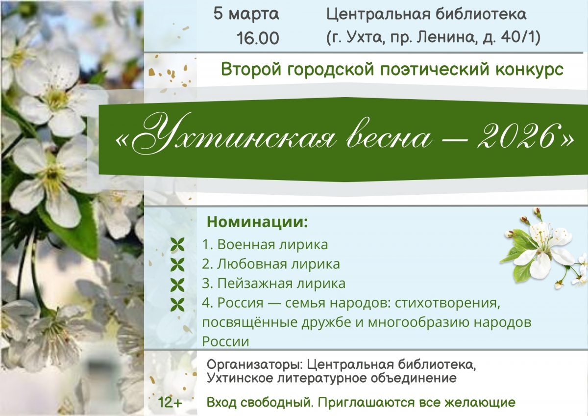 Приглашаем вас принять активное участие во втором городском поэтическом конкурсе «Ухтинская весна-2026», организованном Центральной библиотекой города Ухта совместно с местным литературным объединением.