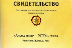 Газета Ухтинского государственного технического университета «Альма-матер» стала обладателем Знака отличия Делового форума «Золотой фонд прессы» 2015 года. Награда была присуждена на подведении итогов форума 22 апреля.