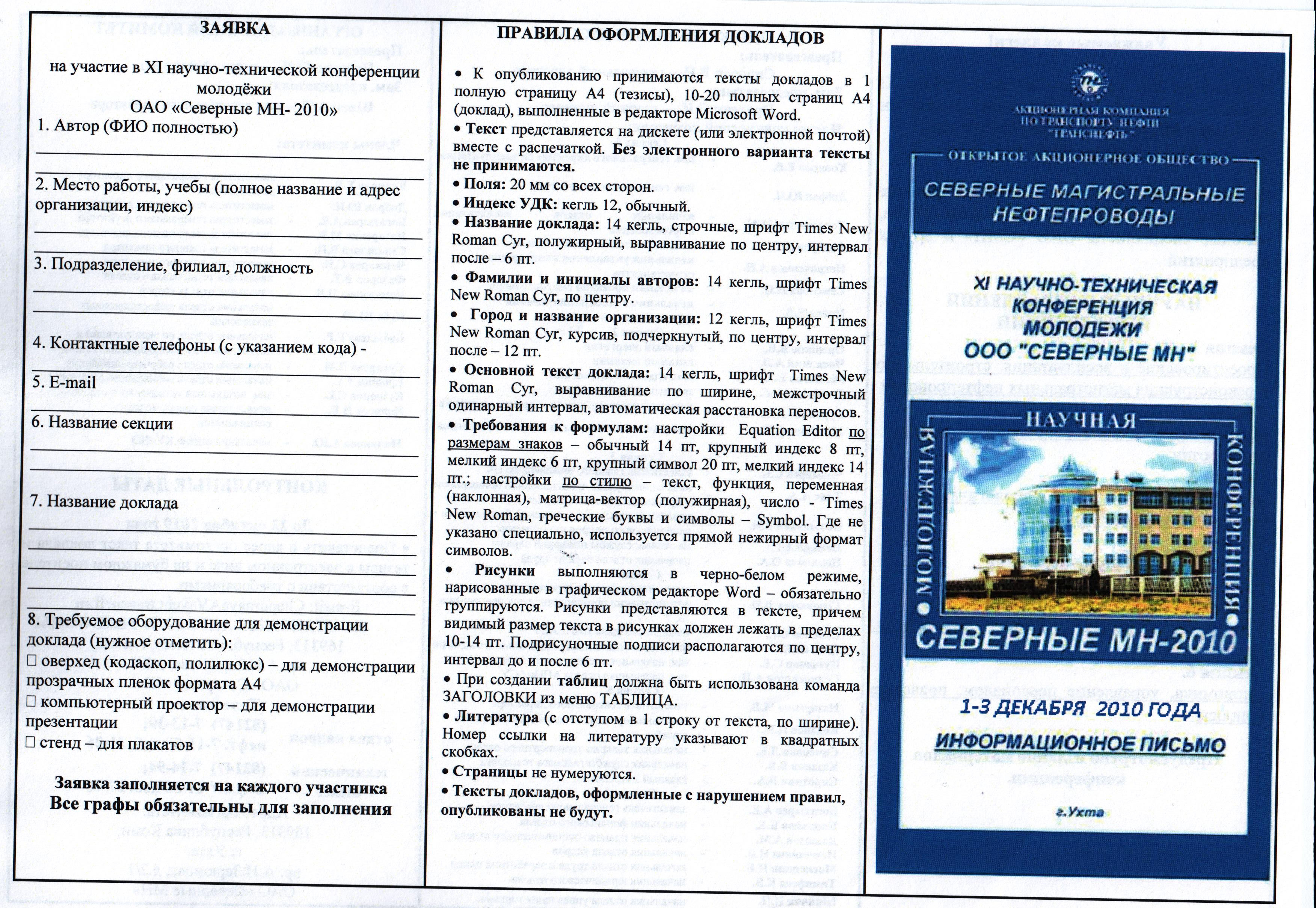 Для участия необходимо оформить заявку и представить в адрес оргкомитета текст доклада и тезисы в электронном виде и на бумажном носителе в соответствие с требованиями до 22 октября 2010 года.