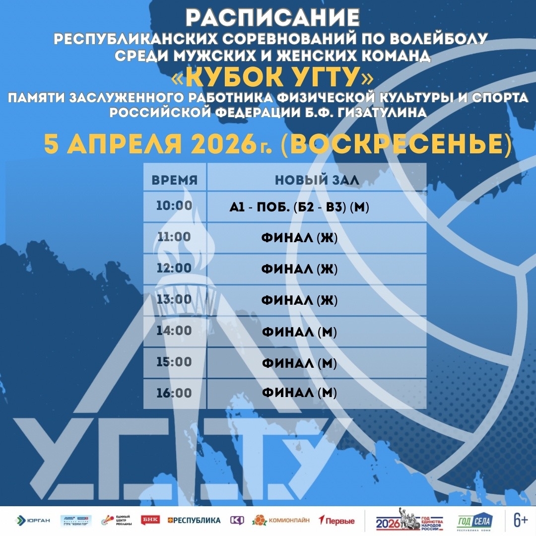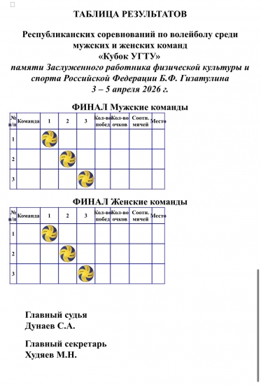 Представляем вашему вниманию расписание игр Республиканских соревнований по волейболу среди мужских и женских команд «Кубок УГТУ» памяти Заслуженного работника физической культуры и спорта Российской Федерации Бориса Гизатулина.