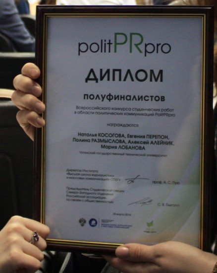 По итогам Всероссийского конкурса студенческих работ в области политических коммуникаций PolitPRpro-2014 команда УГТУ получила диплом Полуфиналистов и ценные подарки.
