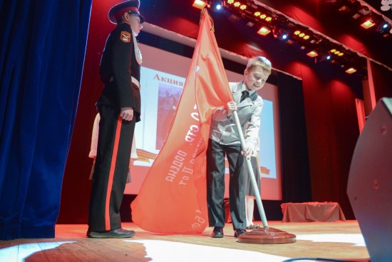 Знаменная группа МСОШ № 6 — шестиклассники Данил Щетков, Анастасия Киселева и Диана Хмелюк — торжественно передали Знамя Победы школе «Росток». Принял победный символ страны третьеклассник Степан Давыдков.
