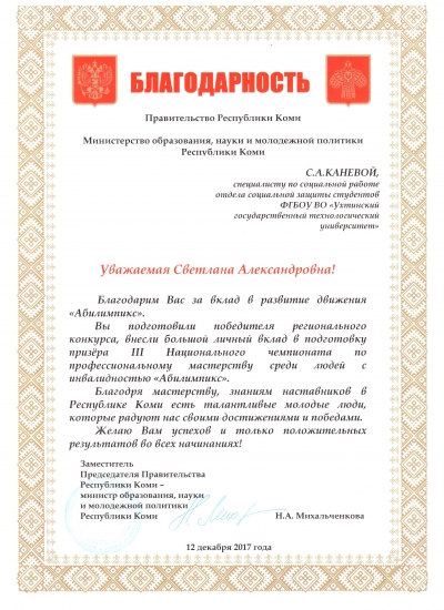 12 декабря 2017 года в Министерстве образования, науки и молодежной политики Республики Коми, в рамках расширенного заседания Совета по делам инвалидов при Главе РК, состоялась торжественная церемония награждения участников III Национального чемпионата по профессиональному мастерству среди людей с инвалидностью «Абилимпикс», на котором специалисту по социальной работе отдела социальной защиты студентов Ухтинского государственного технического университета Светлане Каневой вручена благодарность «за вклад в развитие движения «Абилимпикс»».