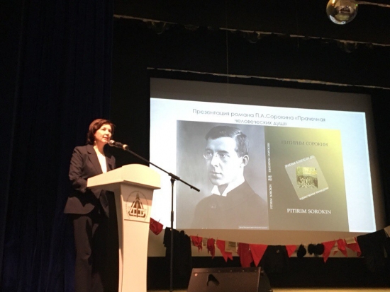 Затем слово было предоставлено руководителю центра «Наследие» имени Питирима Сорокина Ольге Юрьевне Кузивановой, которая рассказала о работе центра по распространению информации о трудах, жизни, творчестве великого социолога, о мероприятиях, посвященных его трудам и его личности. Сотрудниками центра издано пять томов сочинений Питирима Сорокина. Презентуя шестой том, Ольга Юрьевна отметила, что в книгу вошли художественные произведения социолога: рассказы, очерки, путевые заметки и научно-фантастический роман «Прачечная человеческих душ», написанный молодым ученым до эмиграции из России. О. Ю. Кузиванова рассказала об истории создания и содержании романа. Она подчеркнула, что «это произведение знакомит нас с малоизвестной литературной гранью творчества Питирима Александровича Сорокина». После выступления руководитель центра передала в дар УГТУ экземпляр книги.