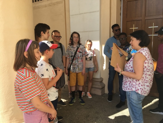 Экскурсия началась с Храма Святителя Стефана Пермского и его удивительной истории: как из театра, а затем из Дома молодёжи здание преобразовалось в церковь. Для того чтобы студенты-иностранцы воочию убедились в этом, Анжела Рочева каждый из объектов демонстрировала на старых фотографиях Ухты из музея УГТУ.