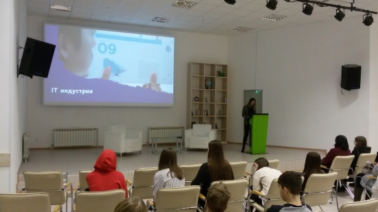 Руководители и сотрудники профильных кафедр ФЭУиИТ Тамара Саматова, Ольга Солдатенкова, Алена Дорогобед, Виктория Пулькина вкратце познакомили старшеклассников с профессиями факультета, обратили внимание на важные нюансы: так, студенты-менеджеры в УГТУ специализируются на нефтяной и газовой промышленности; а на кафедре ВТИСиТ можно пройти профориентационное тестирование для выбора между направлениями «Информационные системы и технологии» и «Информатика и вычислительная техника».