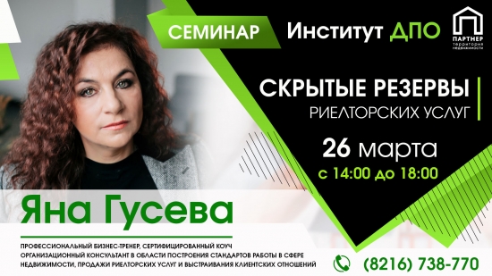 Спикер Яна Гусева – профессиональный бизнес-тренер, сертифицированный коуч. Организационный консультант в области построения стандартов работы в сфере недвижимости, продажи риелторских услуг и выстраивания клиентских отношений.