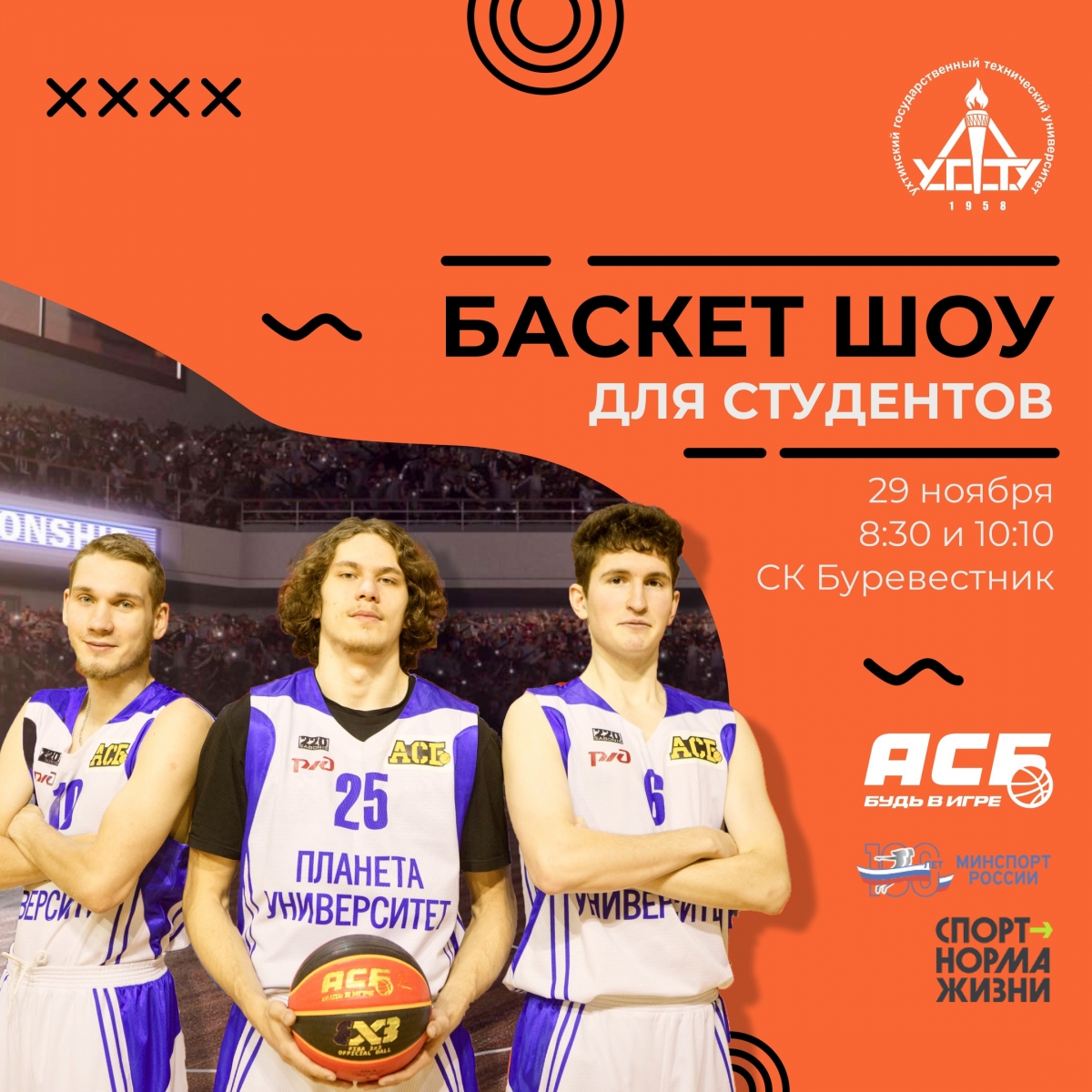 Завтра, 29 ноября, в спорткомплексе «Буревестник» УГТУ состоится спортивно-развлекательное «Баскет шоу»! Мероприятие проводят отдел по развитию студенческого спорта и кафедра физической культуры Ухтинского университета в рамках федерального проекта «Баскетбол студентам».