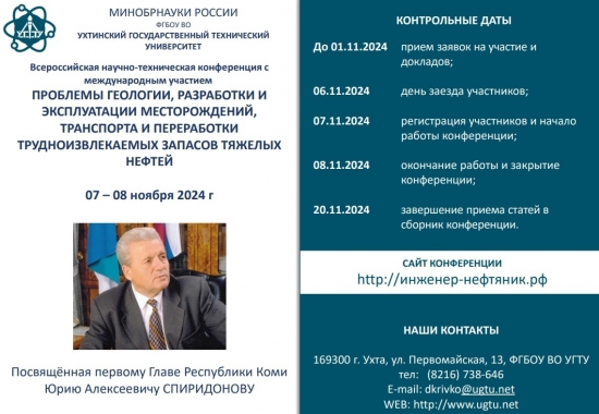 Ухтинский государственный технический университет 7-8 ноября проводит ежегодную межрегиональную конференцию «Проблемы геологии, разработки и эксплуатации месторождений, транспорта и переработки трудноизвлекаемых запасов тяжелых нефтей». Традиционно, конференция посвящена памяти крупного государственного деятеля, первого Главы Республики Коми, профессора Юрия Алексеевича Спиридонова (1938-2010 гг.).