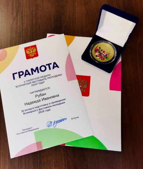 За вклад в подготовку и проведение международного форума Надежда Ивановна получила памятную медаль «Всемирный фестиваль молодежи 2024 года», а также почетную грамоту.