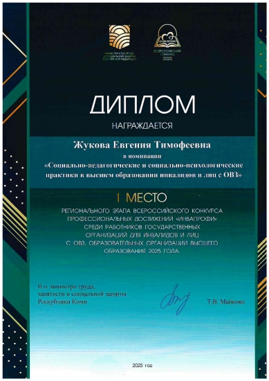 - Евгению Жукову, специалиста по учебно-методической работе той же кафедры, одержавшую уверенную победу в номинации «Социально-педагогические и социально-психологические практики в высшем образовании инвалидов и лиц с ОВЗ»!