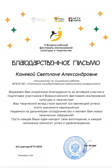 У Егора был первый опыт участия в таком мероприятии, благодаря которому он смог научиться осваивать работу с искусственным интеллектом, его работа была отмечена дипломом участия. Куратором по сопровождению в участии являлась специалист по социальной работе УГТУ, Светлана Канева, чья работа отмечена благодарственным письмом.