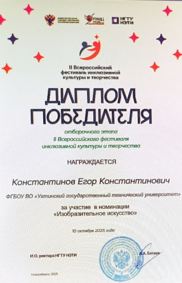 Студент УГТУ, Егор Константинов , принял участие во II Всероссийском фестивале инклюзивной культуры и творчества, который проходил с 19 мая по 10 октября 2025 года.