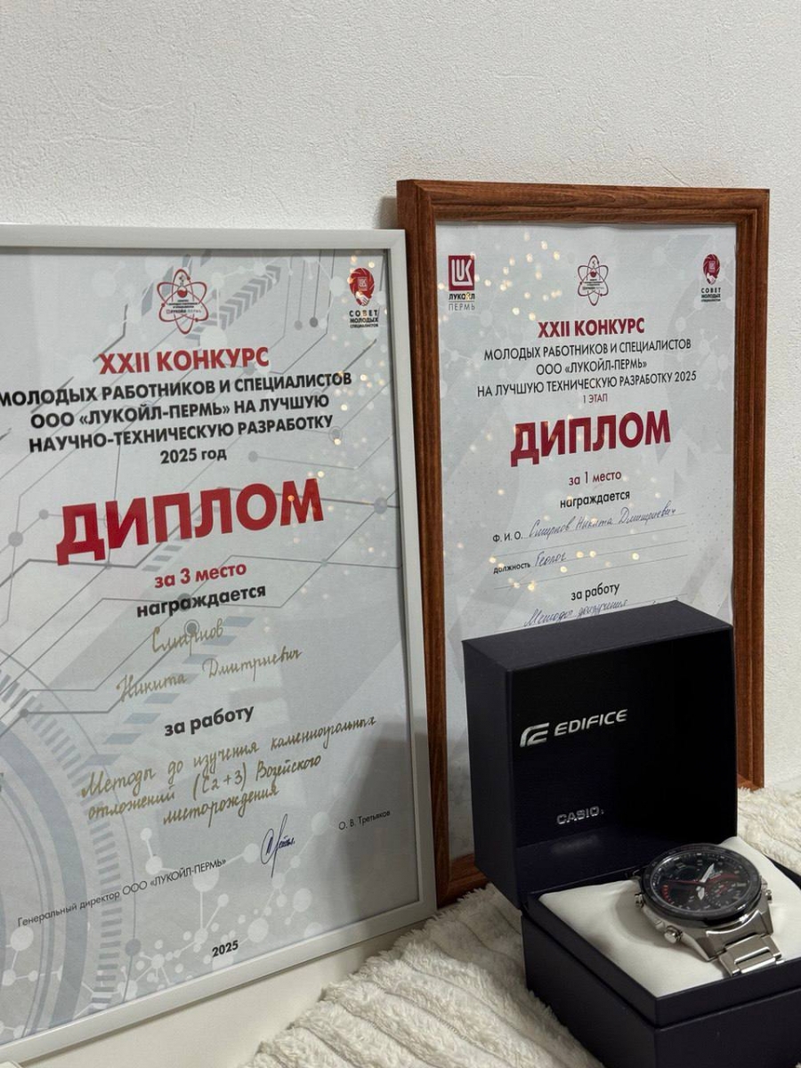 В ноябре в Перми подвели итоги 22-го конкурса молодых работников и специалистов ООО «ЛУКОЙЛ-ПЕРМЬ» на лучшую научно-техническую разработку. В финале, где соревновались 25 лучших проектов всего предприятия, достойно выступил и наш студент. Бронзовым призером престижного корпоративного конкурса стал Никита Смирнов, студент направления «Нефтегазовое дело» Усинского филиала УГТУ и одновременно геолог Цеха добычи нефти и газа №1 ТПП «Усинскнефтегаз».
