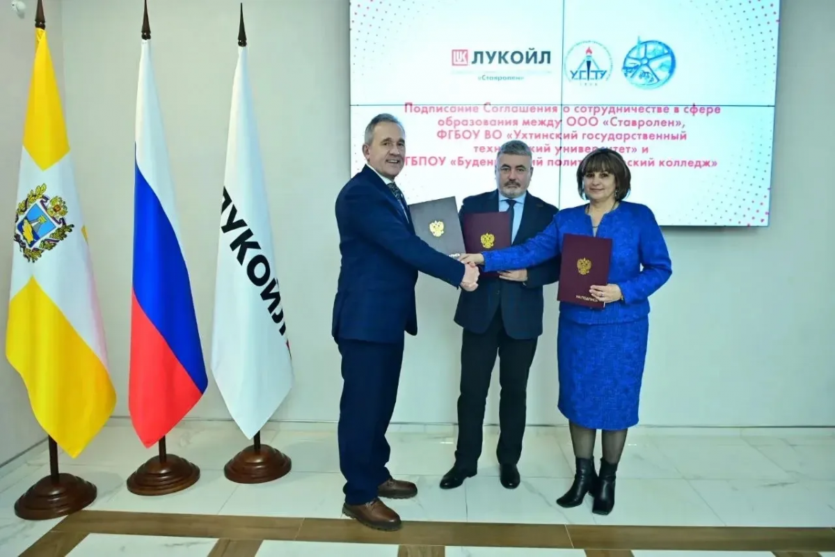 На площадке ООО «Ставролен», входящего в группу ПАО «Лукойл», состоялось подписание трехстороннего соглашения о сотрудничестве в сфере образования между Ухтинским государственным техническим университетом, Государственным бюджетным профессиональным образовательным учреждением «Буденновский политехнический колледж» и самим предприятием.